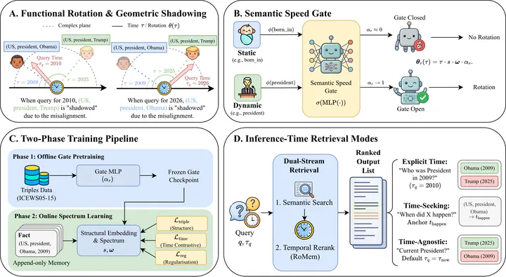 Structured memory representations such as knowledge graphs are central to autonomous agents and other long-lived systems. However, most existing approaches model time as discrete metadata, either sorting by recency (burying old-yet-permanent knowledge), simply overwriting outdated facts, or requiring an expensive LLM call at every ingestion step, leaving them unable to distinguish persistent facts from evolving ones. To address this, we introduce RoMem, a drop-in temporal knowledge graph module for structured memory systems, applicable to agentic memory and beyond. A pretrained Semantic Speed Gate maps each relation’s text embedding to a volatility score, learning from data that evolving relations (e.g., “president of”) should rotate fast while persistent ones (e.g., “born in”) should remain stable. Combined with continuous phase rotation, this enables geometric shadowing: obsolete facts are rotated out of phase in complex vector space, so temporally correct facts naturally outrank contradictions without deletion. On temporal knowledge graph completion, RoMem achieves state-of-the-art results on ICEWS05-15 (72.6 MRR). Applied to agentic memory, it delivers 2-3x MRR and answer accuracy on temporal reasoning (MultiTQ), dominates hybrid benchmark (LoCoMo), preserves static memory with zero degradation (DMR-MSC), and generalises zero-shot to unseen financial domains (FinTMMBench).